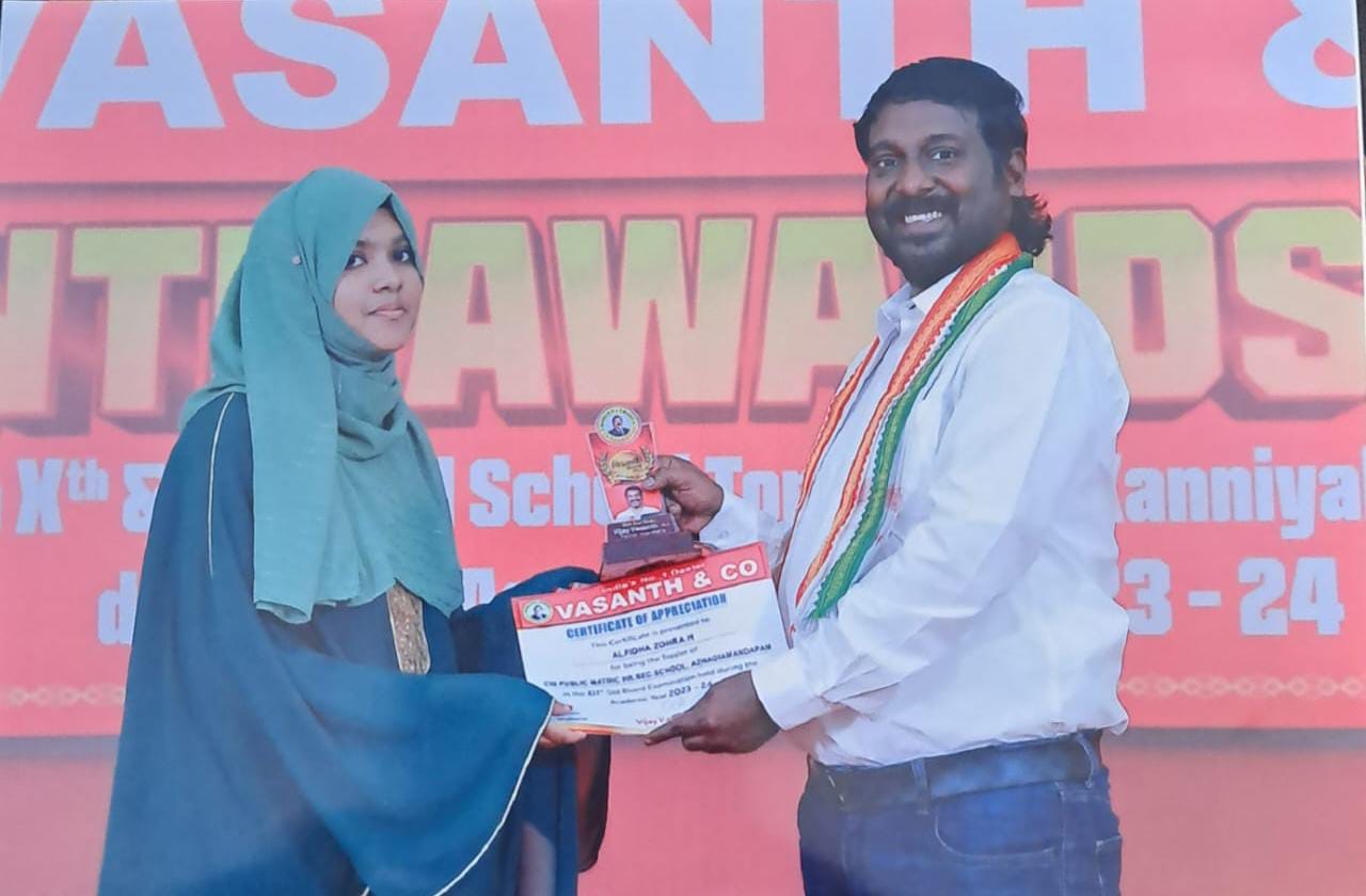 I was honored at the Vasanth Awards 2024 as the School Topper for the academic year 2023–2024. The award was presented by Vijay Vasanth, making it a proud and memorable achievement. This prestigious recognition reflects my academic excellence, dedication, and consistent performance.