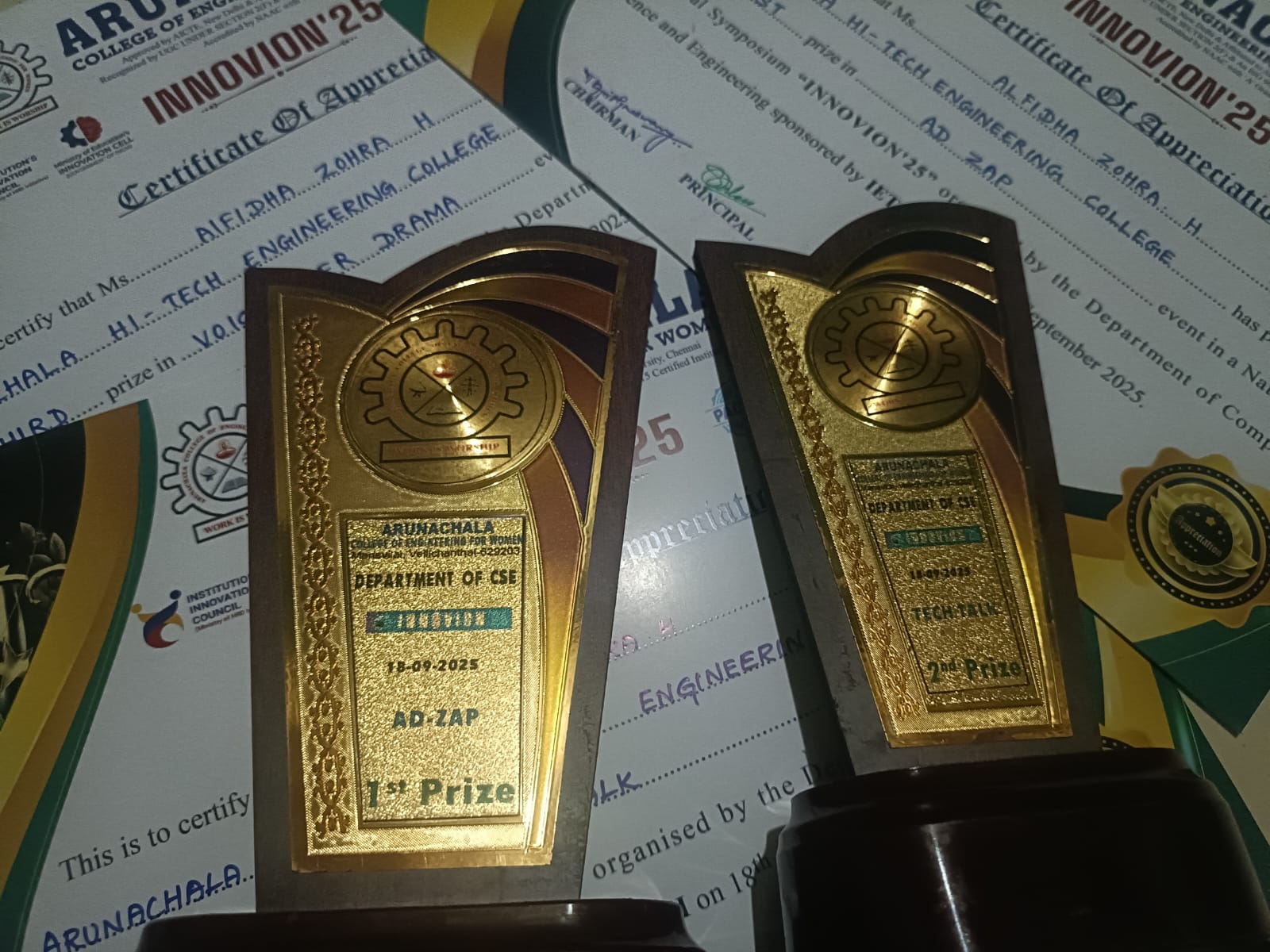 At Innovion’25, I secured 1st Prize in AD-Zap, 2nd Prize in Tech Talk, and 3rd Prize in Voice Over Drama. Competing across creative, technical, and communication-based events showcased my versatility and confidence. These achievements reflect my ability to blend innovation, presentation skills, and creative expression effectively.